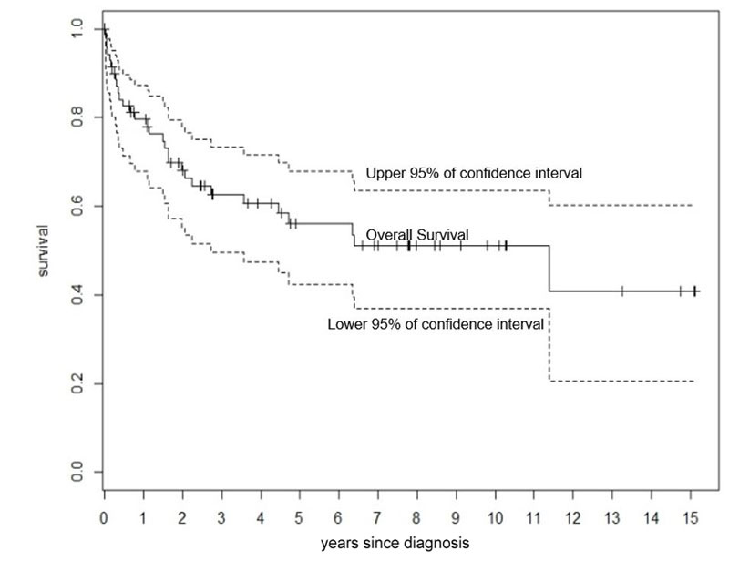 Figure 2 Overall Survival from post-transplant lymphoproliferative disorder diagnosis for both cohorts combined.