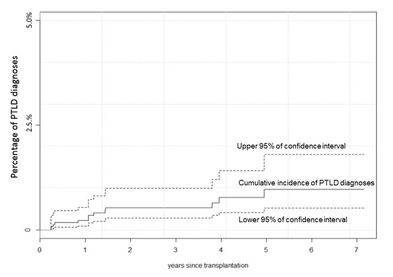 Figure 1 Post-transplant lymphoproliferative disorder cumulative incidence rate according to time after transplantation for solid organ transplant patients in the Swiss Transplant Cohort Study.