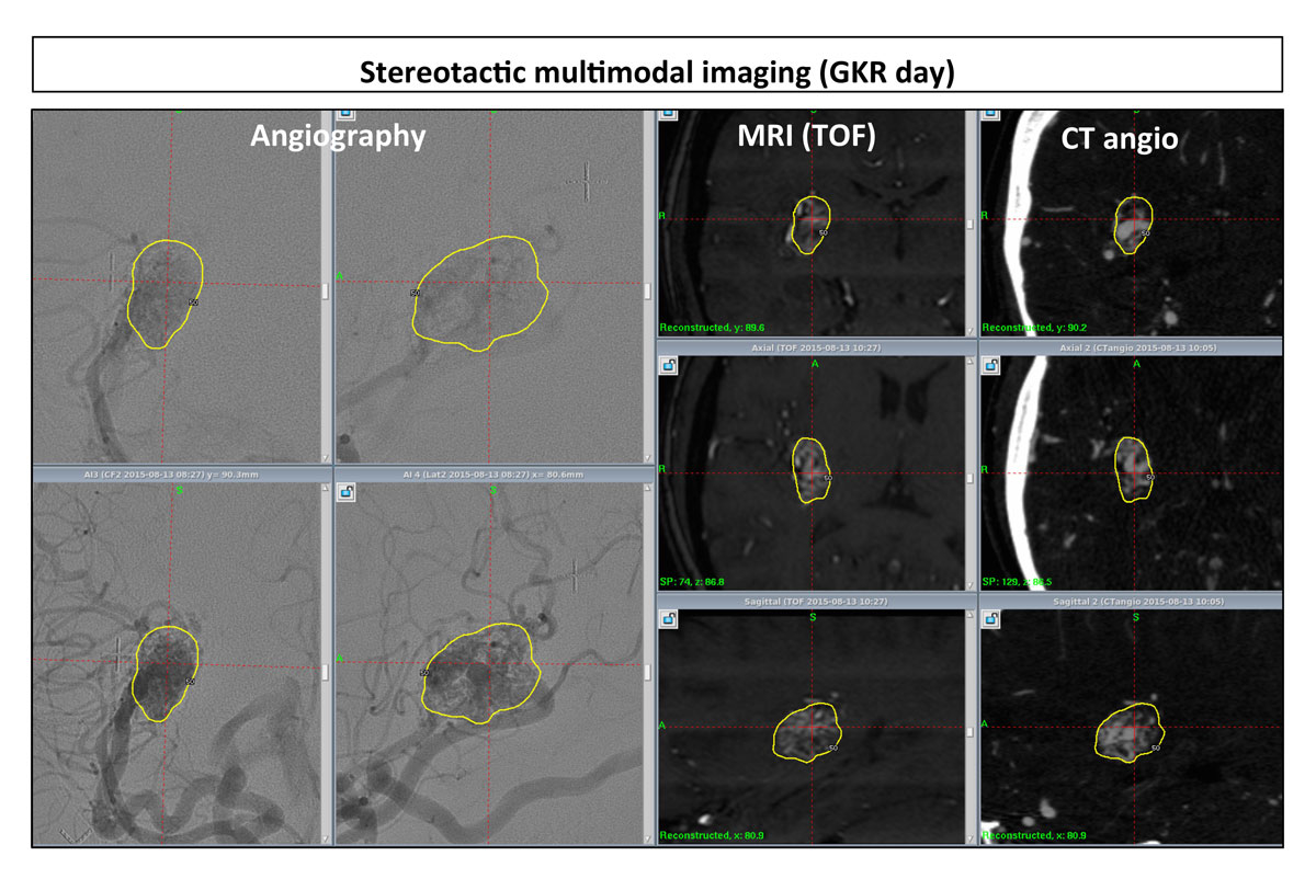 After application of the Leksell Model G stereotactic frame (Elekta Instruments AB, Sweden) under local anaesthesia, all patients underwent stereotactic imaging on the day of GKR. In our Gamma Knife Centre in Lausanne, we always use multimodal imaging for target definition. For AVMs, digital subtraction angiography (DSA), magnetic resonance imaging (MRI) and computed tomography (CT) angiography were used. MRI sequences routinely used Routinely used to better identify the AVM, were time of flight (TOF, 0.6 mm slices) and T1 without and with contrast-enhanced (1 mm thickness). Additional sequences, such as T2 star were employed if necessary to visualise possible previous haemorrhages. CT angiography with bolus contrast injection routinely supplemented the neuroimaging investigation in order to correct for any distortion errors on the MRI and to have complementary information for better targeting (e.g., nidus and complete angioarchitecture) definition (fig. 1).