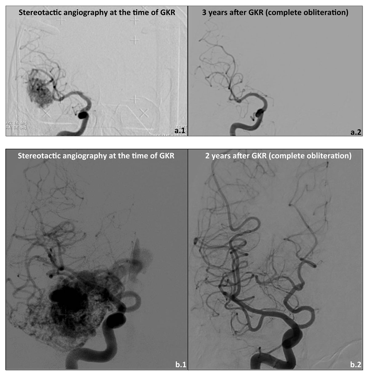 AVMs were among the first GKR indications, with a first treatment in Sweden in the early 1970s. This was directed by use of the standard imaging technique, DSA, which already allowed optimal targeting, even before the appearance of MRI in the early 1980s [26]. The physiopathological mechanisms of obliteration after GKR are related to structural changes within the endothelial cells, followed by myofibroblast proliferation, expansion of the extracellular matrix into the intima and further hyaline transformation of the wall of the irradiated vessels. This occurs mainly in two steps, one related to degeneration/proliferation of the vascular wall and the second involving changes within the connective tissue [27, 28].