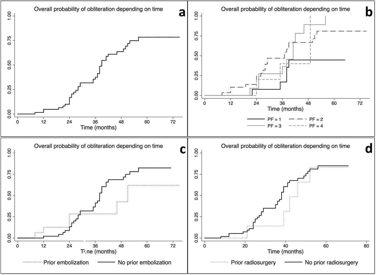 Figure 3 Kaplan-Meier curves showing: (a) the overall probability of obliteration over time; (b) the overall probability of obliteration by Pollock-Flickinger score; (c) the overall probability of obliteration by prior embolisation versus no prior embolisation (p <0.05); (d) the overall probability of obliteration by prior radiosurgery versus no prior radiosurgery (p >0.05).