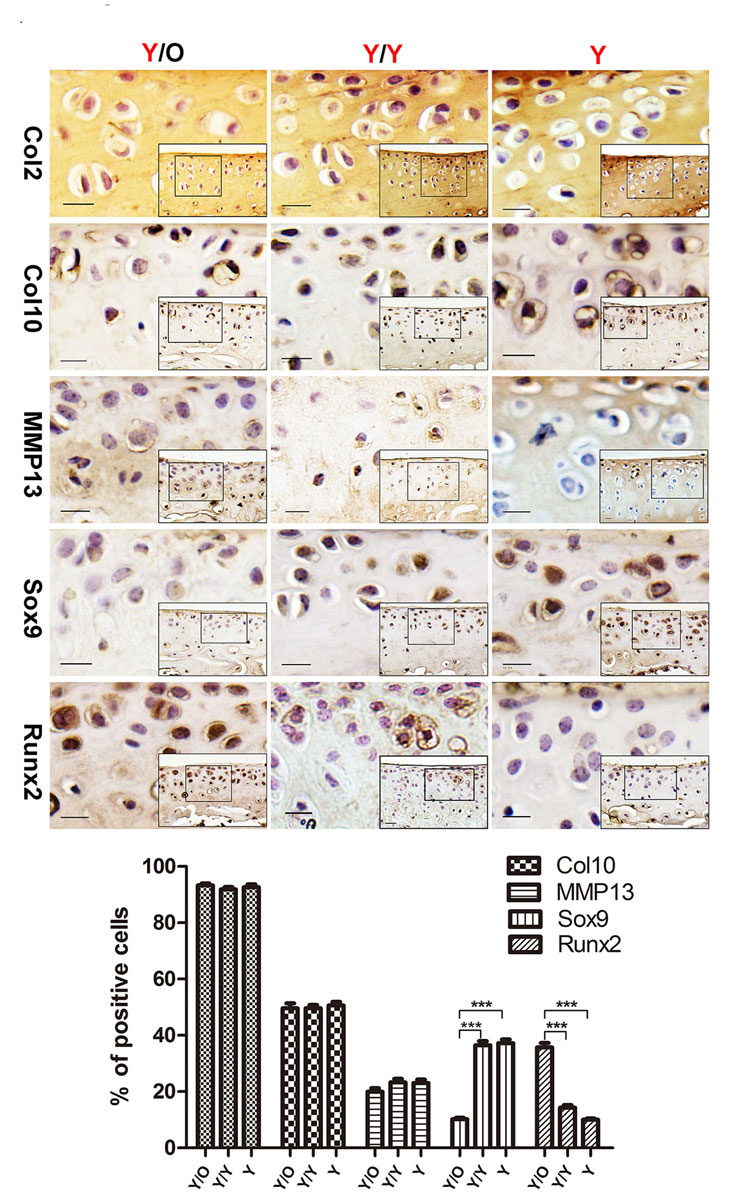 Figure 3 Protein expression of Col2, Col10, MMP13, Sox9 and Runx2 in articular cartilage. Young cartilage samples from Y/O, Y/Y and Y groups were analysed with immunohistochemistry for Col2, Col10, MMP13, Sox9 and Runx2. Col2, Col10 and MMP13 levels in young cartilage showed no statistically significant difference among the Y/O, Y/Y and Y groups (p >0.05). However, the level of Sox9 was reduced and the level of Runx2 was increased in young cartilage from the Y/O group compared to the Y/Y and Y groups. Scale bar = 200 μm. (8 Y/O mice, 10 Y/Y mice and 10 Y mice were used). One-way ANOVA with Tukey’s post-hoc test was used to assess the difference in the percentage of positive cells with Col2, Col10, MMP13, Sox9 and Runx2 protein expression among the three groups.