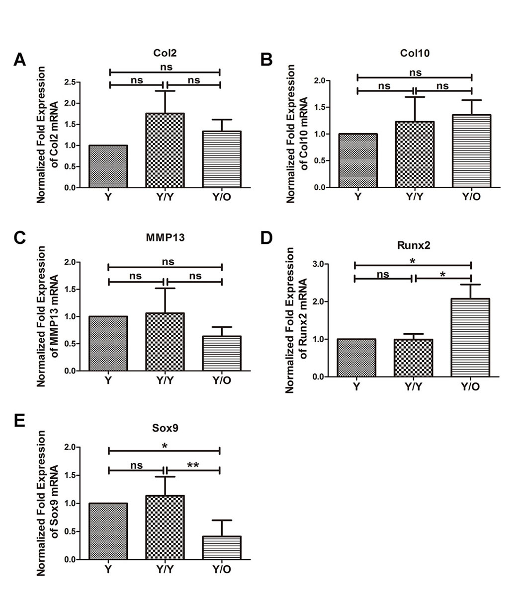 Figure 4 Messenger RNA expression of cartilage-associated genes in articular cartilage. Expression of Col2, Col10, MMP13, Sox9 and Runx2 was determined with qRT-PCR in the articular cartilage samples and no significant differences in the expression of the Col2, Col10 and MMP13 could be detected when the three groups were compared (A, B, C). However, a significant increase in the expression of Runx2 and a significant decrease of Sox9 were measured in young cartilages from the Y/O group (D, E) (8 Y/O mice, 10 Y/Y mice and 10 Y mice were used). One-way ANOVA with Tukey’s post-hoc test was used to assess the difference in mRNA expression of Col2, Col10, MMP13, Sox9 and Runx2 among the three groups.
