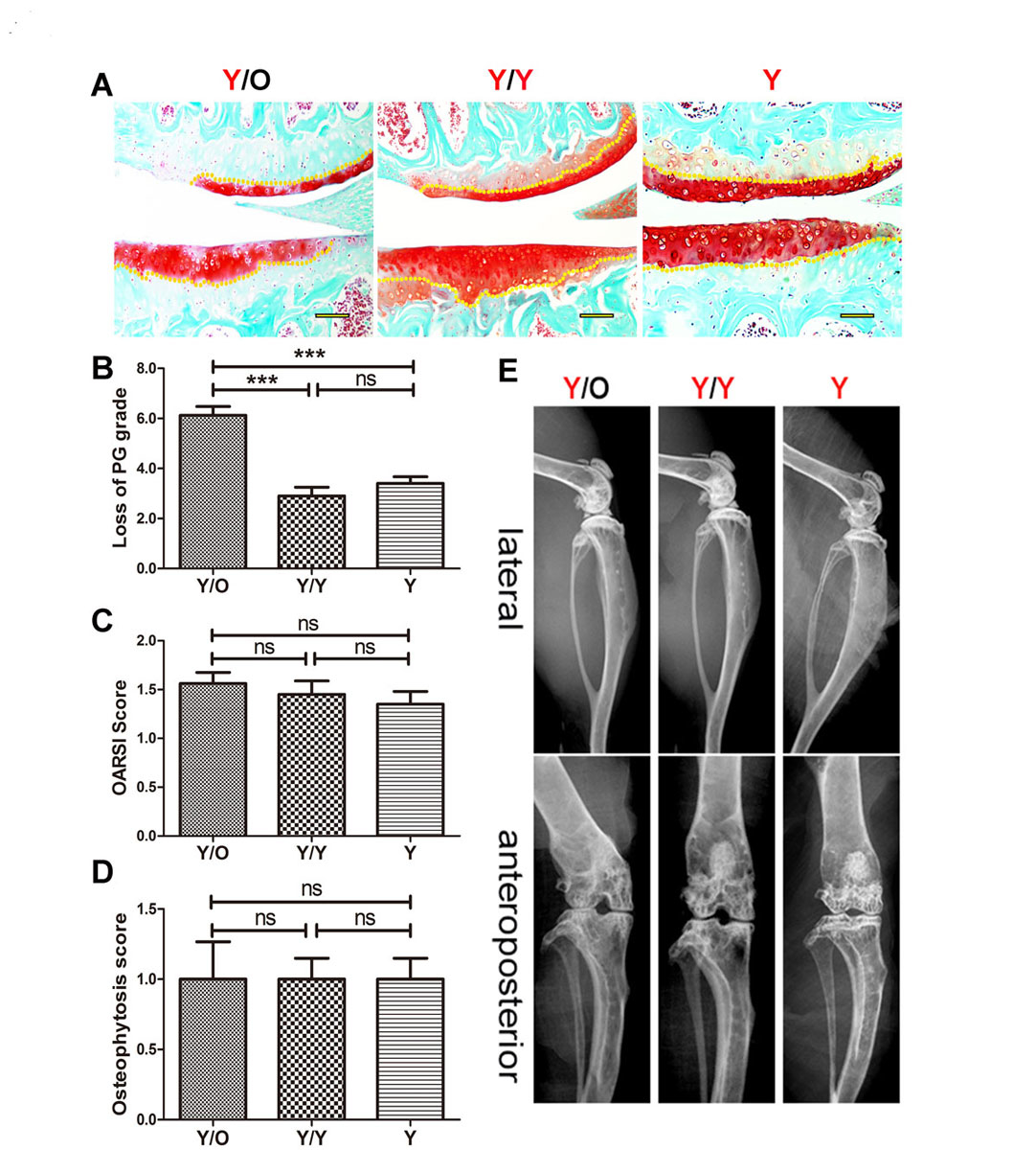 Figure 2 Histological and radiographic changes in cartilage of young mice in the Y/O, Y/Y and Y groups. (A) PG decrease in young cartilage from the Y/O group was greater than that from the two other groups and histological scores in the Y/O group were relatively higher. Representative images are shown (8 Y/O mice, 10 Y/Y mice and 10 Y mice were used) Scale bar = 500 μm. (B) Loss of cartilage (proteoglycan grade) in young mice from the Y/O group was significantly greater compared to the Y/Y and Y groups. The area covered from the surface of the cartilage to the yellow dotted lines indicates the proteoglycan content. (C) There was no statistically significant difference in OARSI score among the three groups (p >0.05). (D, E) No significant pathological changes were detected in the micro-X-ray. The presence and severity of osteopenia and sclerosis among the three groups were not evident in this study, and osteophytosis was detected at the margins of the knee joint in young mice from the three groups. There was no statistically significant difference in osteophytosis scores among the three groups (p >0.05). The differences of the proteoglycan content, the Osteoarthritis Research Society International (OARSI) score and the osteophytosis scores among three groups were assessed by one-way ANOVA with Tukey’s post-hoc test.