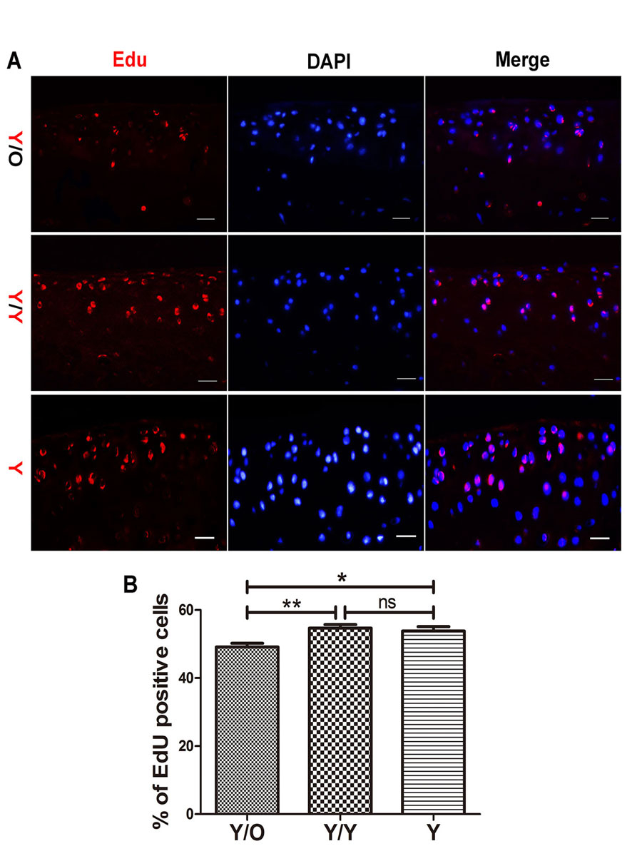 We further quantified chondrocyte proliferation using EdU, which accurately reflects cell proliferation. The presence of more EdU-positive cells indicates increased cell proliferation. Interestingly, we found that the percentage of EdU-positive chondrocytes in young cartilage from the Y/O group was significantly lower than in the Y/Y and Y groups. The number of EdU-positive chondrocytes in young cartilage from the Y/Y and Y groups showed no statistically significant difference, indicating that the change was not due to surgery (fig. 3). This observation showed that chondrocyte proliferation was reduced in young mice from the heterochronic parabiosis model and suggested that changes to chondrocyte proliferation occurred before gross cartilage change during the process of OA.