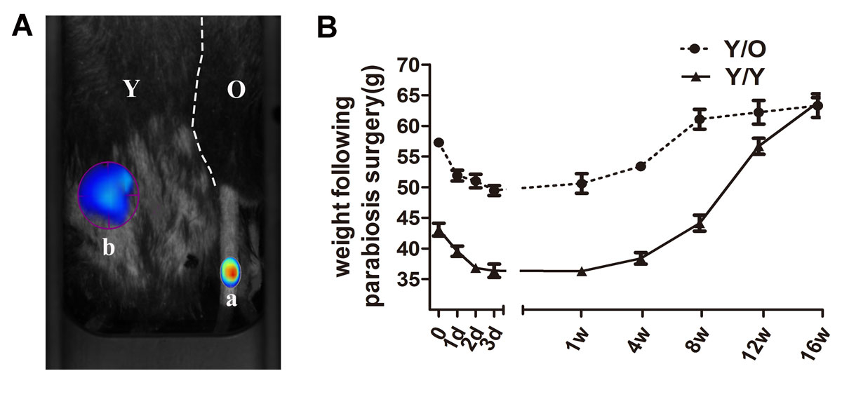Figure 1 Common circulation between two mice in the heterochronic parabiosis model. (A) At 2 weeks after parabiosis surgery, the old mouse of the parabiotic pair received an injection of ProSense 750FAST through the tail vein (position a) and ProSense 750FAST was activated around the needling wound in the young mouse of the parabiotic pair (position b), which was imaged with the FMT system 24 hours after injection. ProSense 750FAST agent was activated in the young mouse, which indicated that the mice had developed a shared blood circulation. (B) Absolute weights of the pairs (parabionts) measured at various times during recovery (8 Y/O pairs and 5 Y/Y pairs). Immediately following the surgery, both groups appeared to lose weight, which was followed by steady normalisation of the body weight.