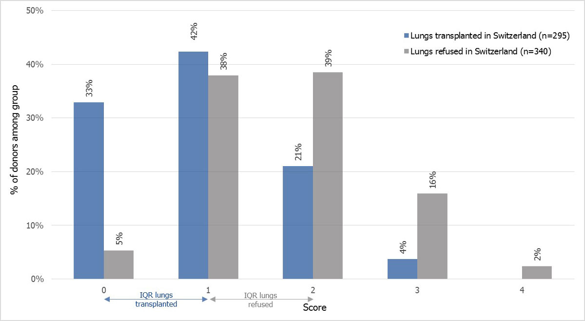 Figure 3 Adapted Zurich donor score for accepted lung donors (blue) vs refused lung donors (grey). Arrows show the interquartile ranges (IQRs) of the score distribution of each group.