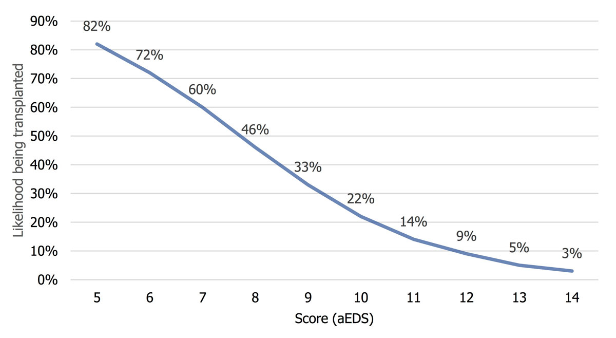 Figure 4 Probability of a donor lung being transplanted in Switzerland according to adapted Eurotransplant donor score (aEDS), based on a logistic regression model.