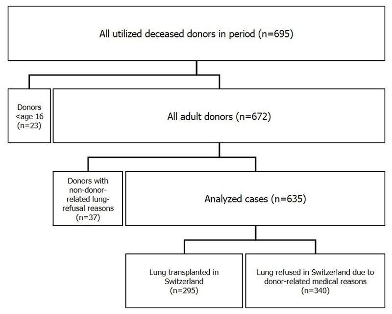 The term “accepted lung donor” in this article refers to a donor from whom at least one lung lobe was transplanted in Switzerland. Likewise, the term “refused lung donor” refers to the refusal of both donor lungs in Switzerland primarily for donor-related medical reasons. Figure 1 shows derivation and composition of analysed cases.
