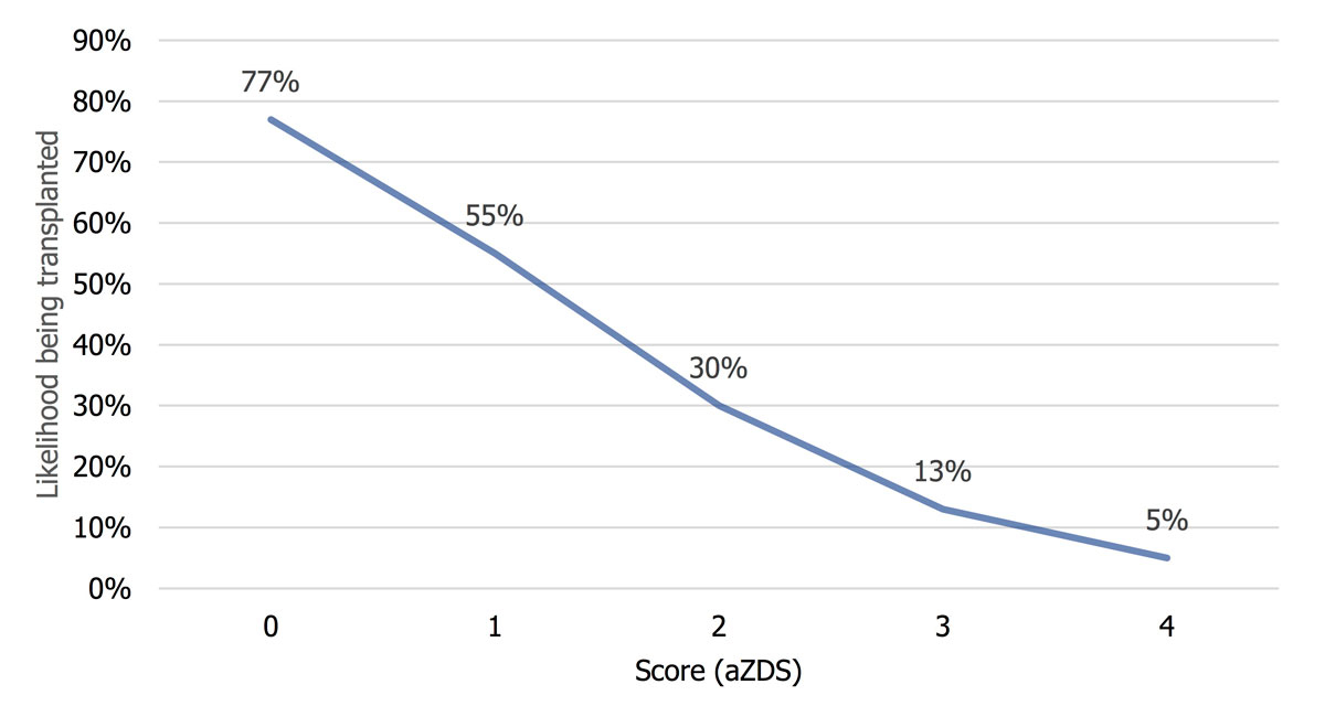 Interestingly, the aZDS, which includes only four criteria selected solely on the basis of expert opinion, has as much discriminative power as the aEDS, which includes five criteria selected on the basis of results of a detailed statistical analysis (the discriminative power of aZDS was even found to be slightly higher than the one of aEDS even though not significantly). In other words, the aZDS may lack a statistics-based methodology compared with the aEDS, but transplant teams could apply both scores equally in their assessment of donor quality, with the aZDS being easier and faster to calculate.