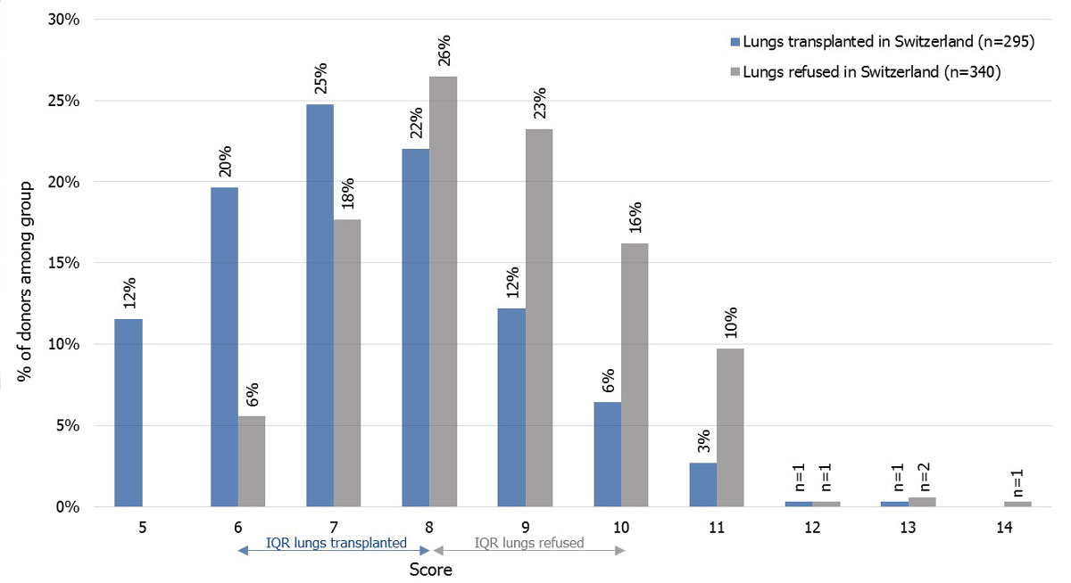Figure 2 Adapted Eurotransplant donor score frequency distribution for accepted lung donors (blue) vs refused lung donors (grey). Arrows show the interquartile ranges (IQRs) of the score distribution of each group.