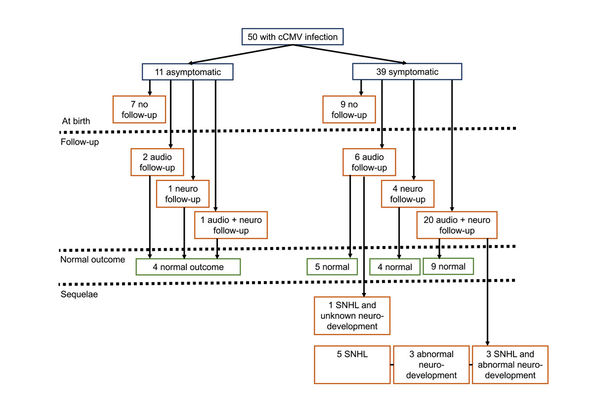 From the 50 infants with a cCMV infection, audiological assessment (range 3–26 months) performed by the ENT specialist was available for 29 (58%), 27 (93%) of whom had normal hearing in the best ear; among the 58 ears assessed, 81% had normal thresholds. Among the 50 newborns with cCMV infection, neurodevelopment follow-up (range 6–72 months) from 2001 to 2015 was available for 26 (52%) infants born between 2001 and 2014. Of these 26, 21 (81%) were offered follow-up as a result of neurologically symptomatic cCMV infection. Of those 26, 6 (23%) patients presented with abnormal neurodevelopment of whom 3 had SNHL (table S2, appendix 1).