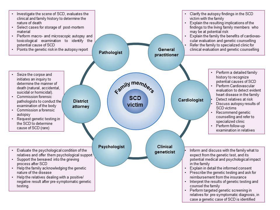 The procedures following a SCD involve not only forensic doctors, but also cardiologists, geneticists, general practitioners, pathologists and psychologists, who should provide a comprehensive optimal “cardiogenetic counselling”. There is a need to update and improve the general knowledge concerning the genetic risk of cardiovascular pathologies and the importance of an autopsy and genetic testing, not only among the medical community but also among the juridical and public health authorities.