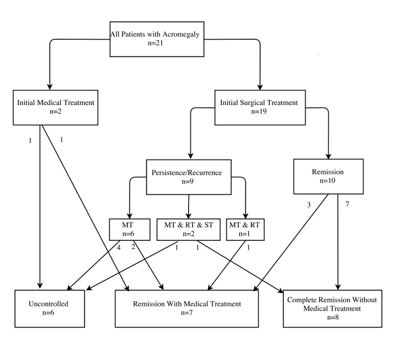 Our main endpoint was clinical cure, defined as complete remission, remission with need for medical treatment, and uncontrolled disease defined by non-normalisation of IGF-1 and growth hormone levels measured at random or during a 75-g oral glucose tolerance test. In patients with uncontrolled disease, we either did not have any surgical/radiotherapy options with a justifiable risk, or patients refused these treatments, or both. All such cases were discussed between the clinical team, including neurosurgeons and endocrinologists, and the patient, as part of routine care in our institution.