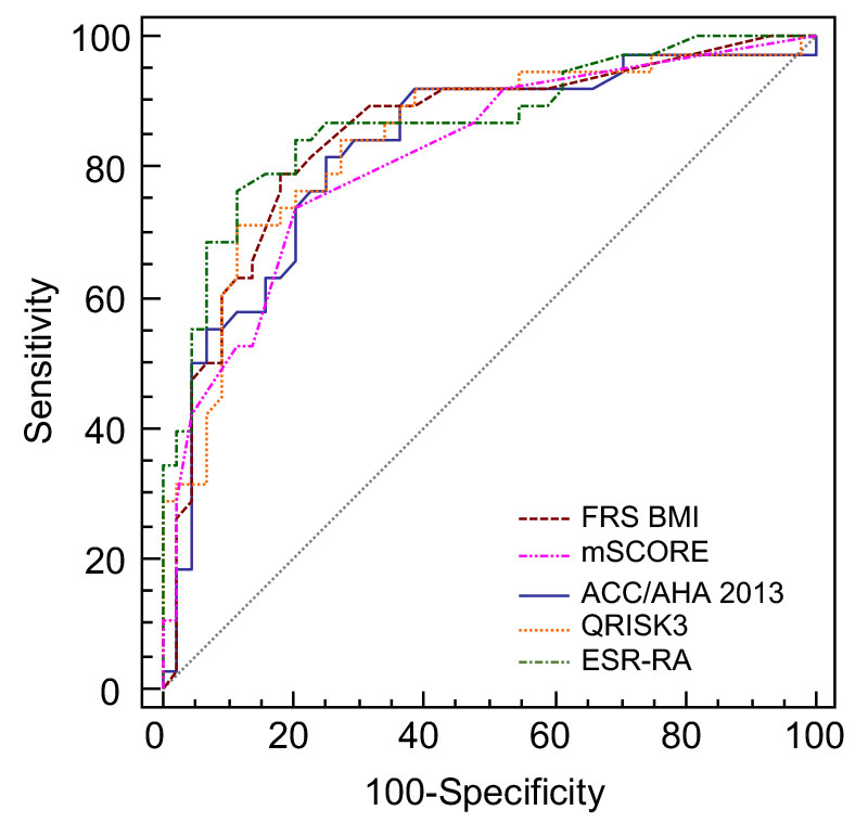 Values were expressed as the mean ± standard deviation (SD) unless indicated otherwise. The univariate analysis to identify variables associated with high-risk patients was investigated using the student’s t-test (parametric data) or the one-way analysis of variance (ANOVA) to compare means of more samples. Qualitative variables were tested using chi-square tests. The ability of the ERS-RA to discriminate between patients with and without subclinical atherosclerosis compared with the other CVD risk indices was determined through area under the receiver operating characteristic curves (AUC-ROCs) analysis.
