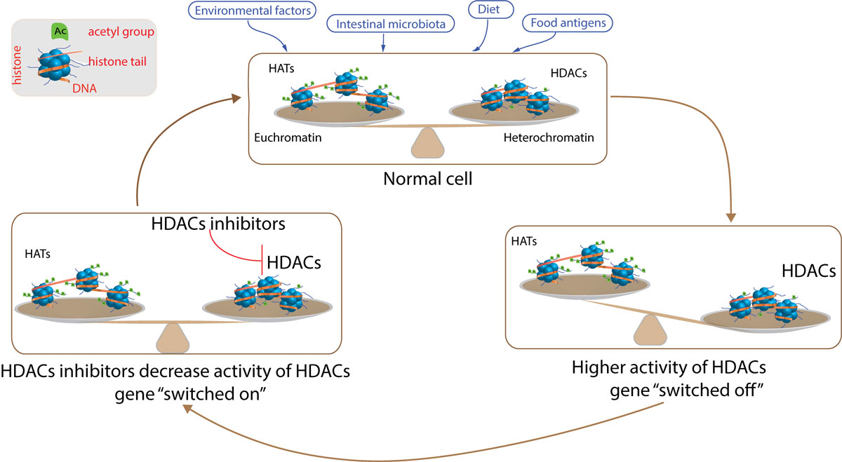 Figure 1 Epigenetic regulation of gene expression – histone acetylation. Cells in the gastrointestinal track are exposed to several environmental factors, dietary antigens, intestinal microbiota and microbiota derived-metabolites that may modulate epigenetic machinery. In the steady state, there is a balance between acetylation and deacetylation. Increased activity of histone deacetylases (HDACs) leads to higher histone deacetylation, which causes formation of heterochromatin and silences gene expression. On the other hand, treatment with HDAC inhibitors decreases HDAC activity and restores balance between acetylation and deacetylation in the cell, allowing genes to be transcribed. HAT = histone acetyltransferase