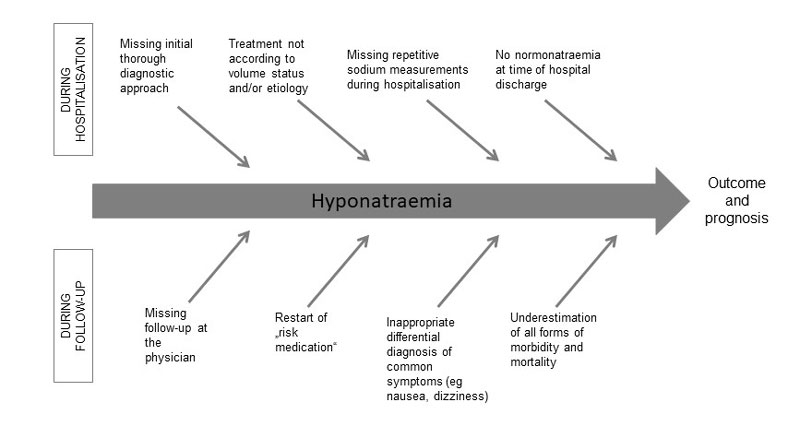 Figure 4 illustrates the factors with the highest impact on outcome and prognosis of hyponatraemia identified in this retrospective analysis. Especially, a comprehensive initial diagnostic approach seems crucial for appropriate classification and thus treatment of hyponatraemia. As this approach was often inadequate or lacking, inappropriate treatment was the consequence (verifiable in 114 of 368 patients). We assume that the lack of sustained normalisation of plasma sodium as evidenced by persistent hyponatraemia at discharge in almost every second patient (this high rate of patients still being hyponatraemic on hospital discharge was confirmed by other studies [23]) was responsible, at least in part, for the high rate of clinically apparent residual deficits at the time of discharge. The report of the Hyponatraemia Registry stated a poor correction rate even with appropriate therapy [23].