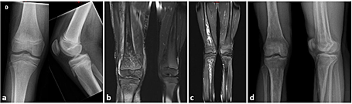 Note the rapid evolution from a normal X-ray on day 1 (a) to persisting defects after 5 years (d), and between magnetic resonance imaging on day 3 (b) and at 10 months (c).