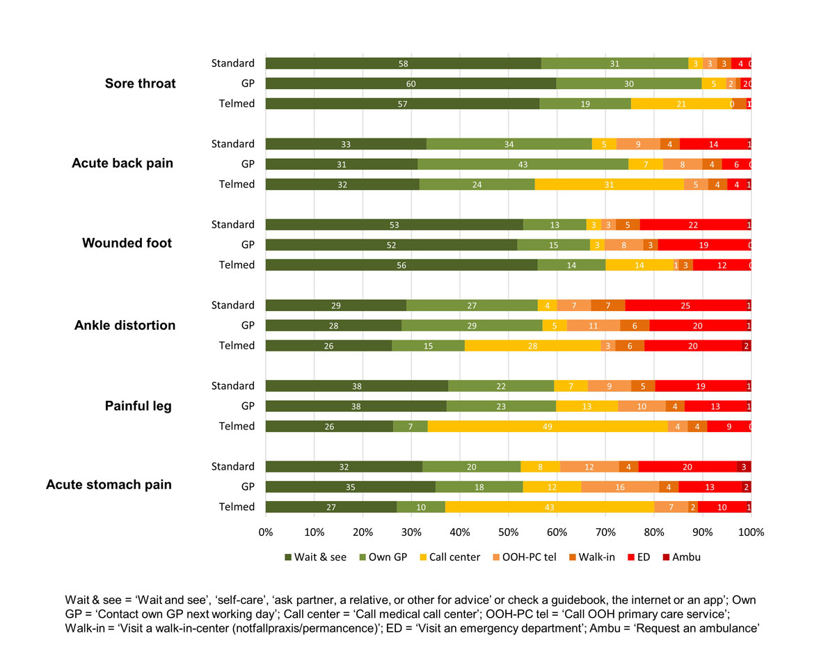 In figure 1, we present the answers given by the respondents on each of the six cases, divided by type of HCP. Overall, persons with a standard insurance more often intended to contact the ED than patients with an alternative HCP (mean six cases: standard 17%, GP 12%, Telmed 9%). Compared with persons with a standard or GP HCP, persons with a Telmed insurance more often chose to call the medical call centre (mean six cases: standard 5%, GP 8%, Telmed 31%). Detailed results of the association between intended OOH help-seeking and the various HCPs, stratified according to the six case scenarios, are given in appendix 2.