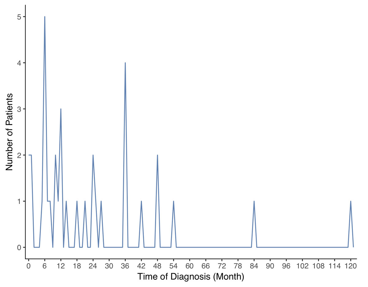Figure 2A Interval between onset of symptoms and diagnosis: distribution of the time to diagnosis. On the y-axis the number of patients which had been diagnosed at a given time (x-axis).