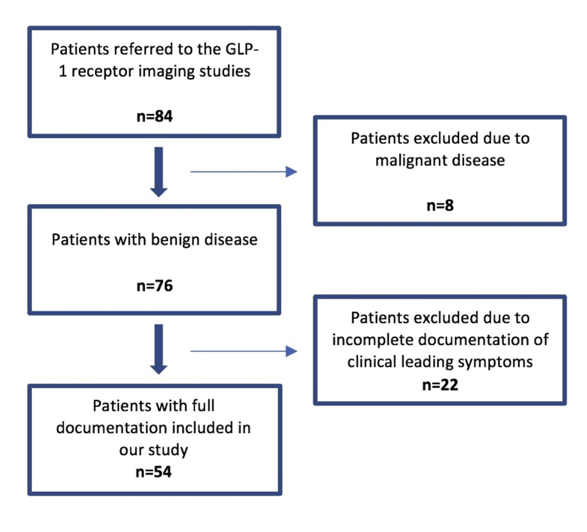 In summary, the current literature suggests that clinical symptoms, which lead to the investigation and documentation of EHH, are essentially neurological in nature and/or of sympathicoadrenal origin. However, they vary considerably and are ill defined, which may lead to a wide range of disease durations until the diagnosis is formally established. We, therefore, aimed at retrospectively analyse the main clinical symptoms, the time interval between first symptoms and final diagnosis, and the characteristics of the biochemical investigation (duration of fasting test; glucose, C-peptide and insulin levels at the end of the fasting test) in patients with EHH. This analysis was in the framework of two prospective studies investigating a new molecular imaging technique using glucagon-like peptide-1 (GLP-1) receptor imaging.