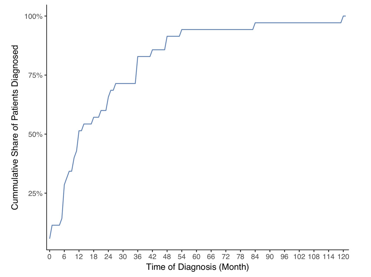 Figure 2B Interval between onset of symptoms and diagnosis: cumulative share of the patients diagnosed with EHH in the course of time.