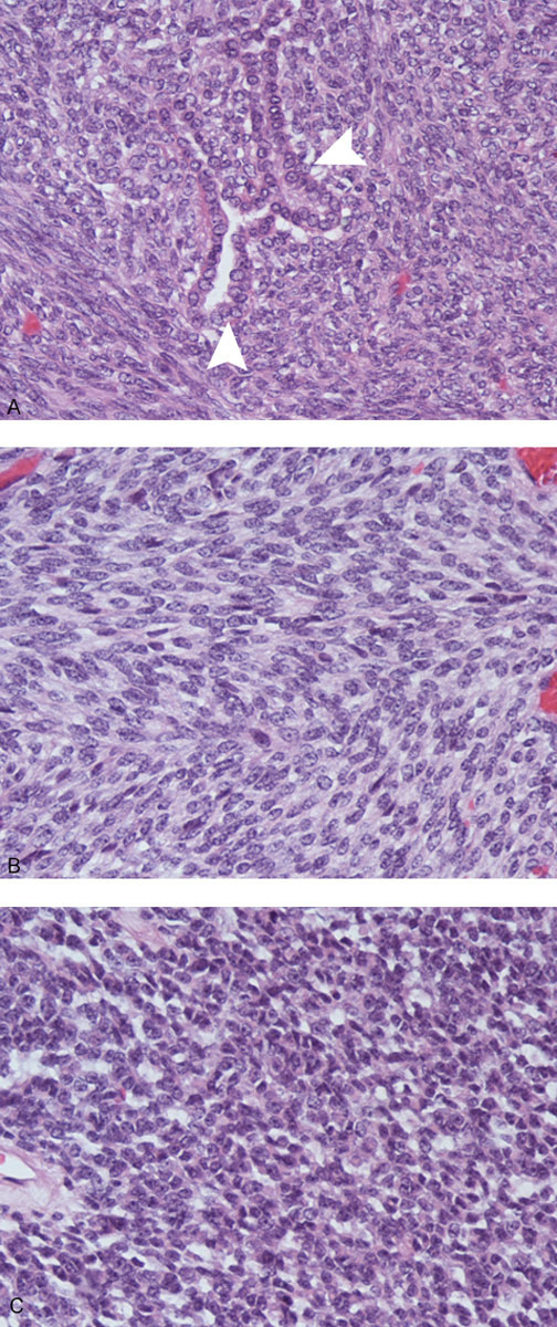 Figure 1 Histology of synovial sarcoma. Top: biphasic synovial sarcoma displaying glandular structures (arrowheads); middle: monophasic synovial sarcoma composed predominantly of densely packed spindle cells; bottom: poorly differentiated synovial sarcoma composed of round cells with scant cytoplasm that falls into the morphologic category of small round blue cell tumours.