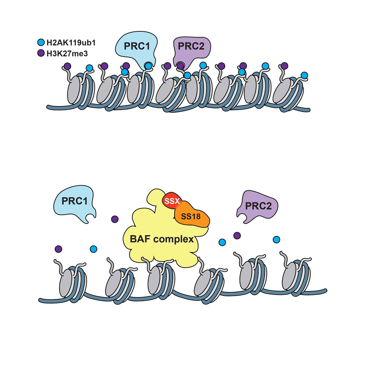 Figure 4 Polycomb repressor complexes induce chromatin compaction (upper panel); the BAF/SS18-SSX complex evicts PRC1/PRC2 causing displacement or decay of their marks and inducing chromatin relaxation (lower panel).