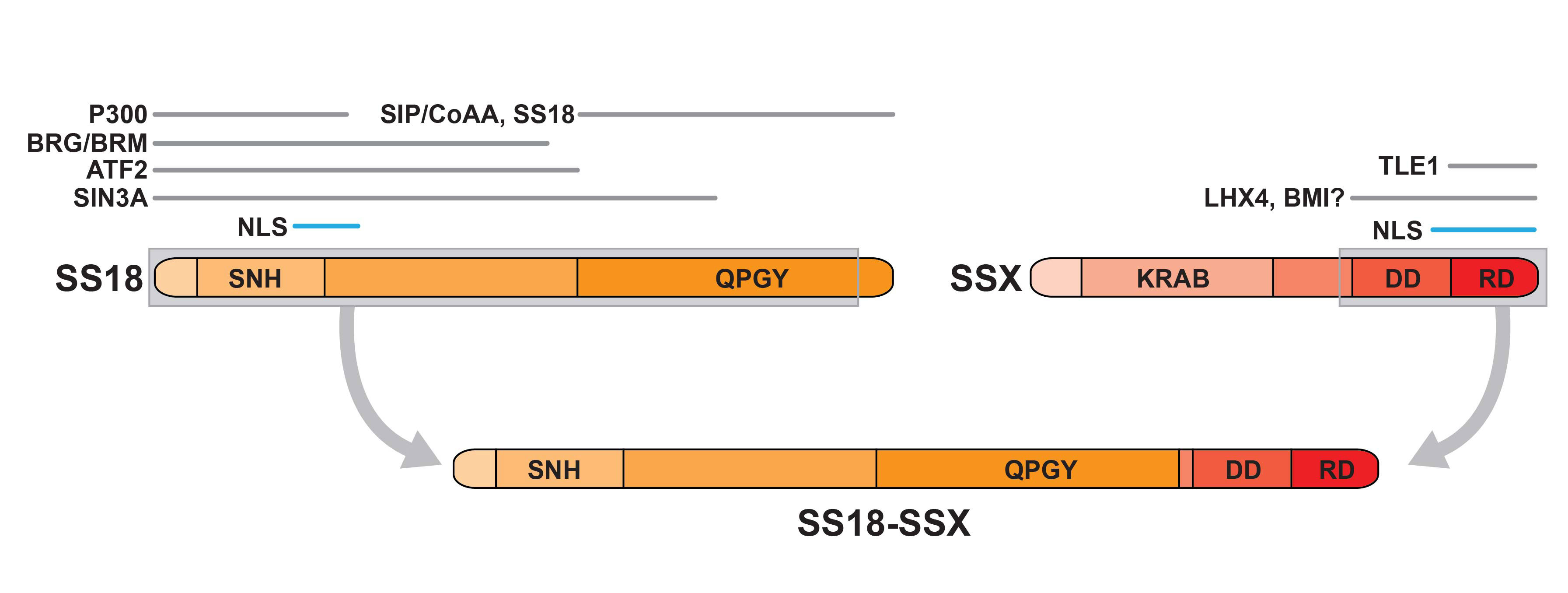 Figure 2 The SS18-SSX fusion protein. Illustration of the domain structure of SS18 and SSX and the regions within each that support interaction with the indicated proteins. The grey encasing indicates the segments of each partner that form part of the fusion protein (below). The indicated fusion partner domains are: SNH, SS18 N-terminal homology; QPGY, glutamine-proline-glycine-tyrosine-rich domain; KRAB, Kruppel-associated box domain; DD, divergent domain; RD, repression domain; NLS, nuclear localisation signal.