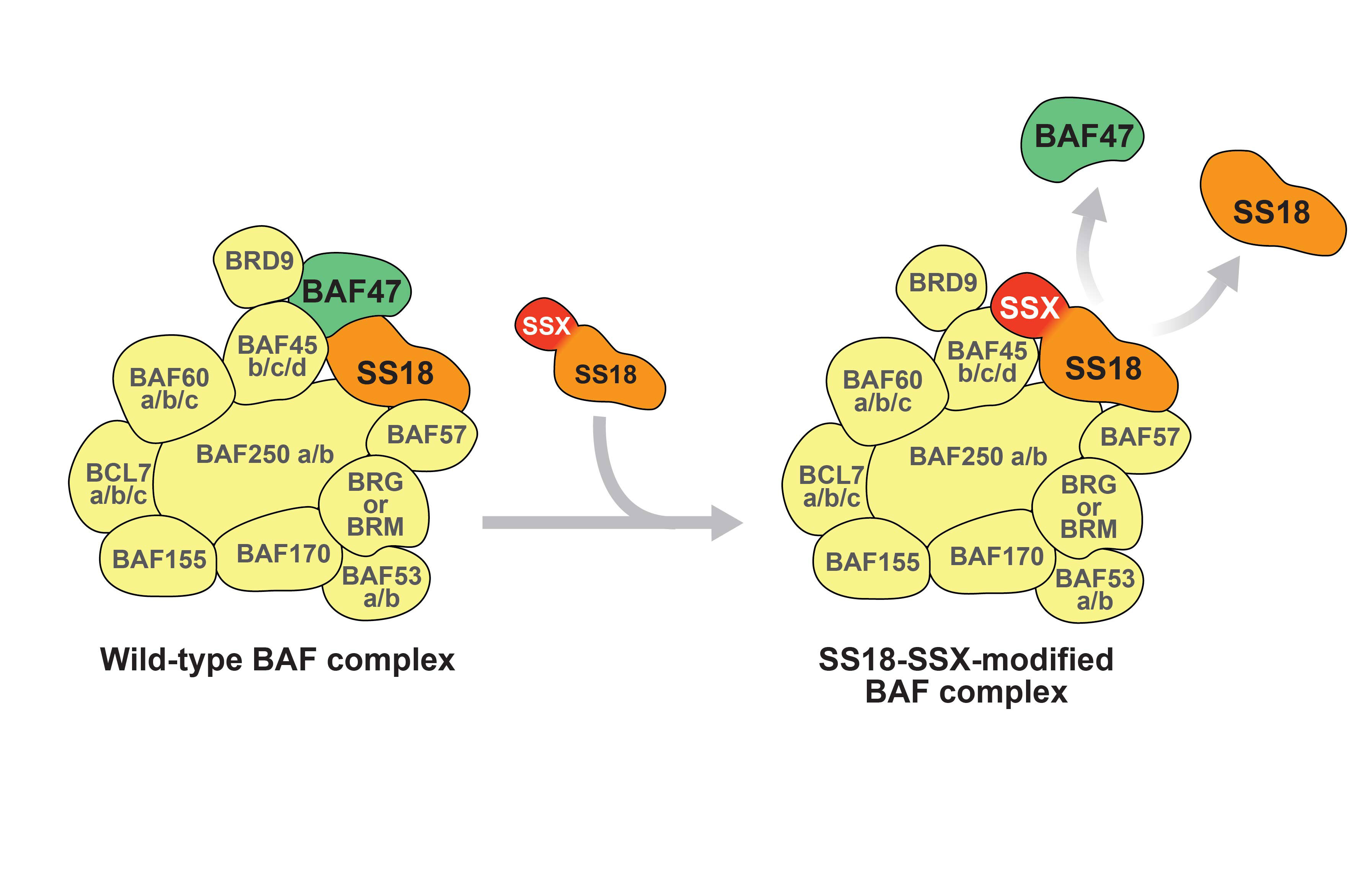 Figure 3 Relationship between SS18, SS18-SSX and the BAF complex. SS18 is an integral part of the wt BAF complex (left). The SS18-SSX fusion protein displaces wt SS18 and BAF47 within the complex (right).