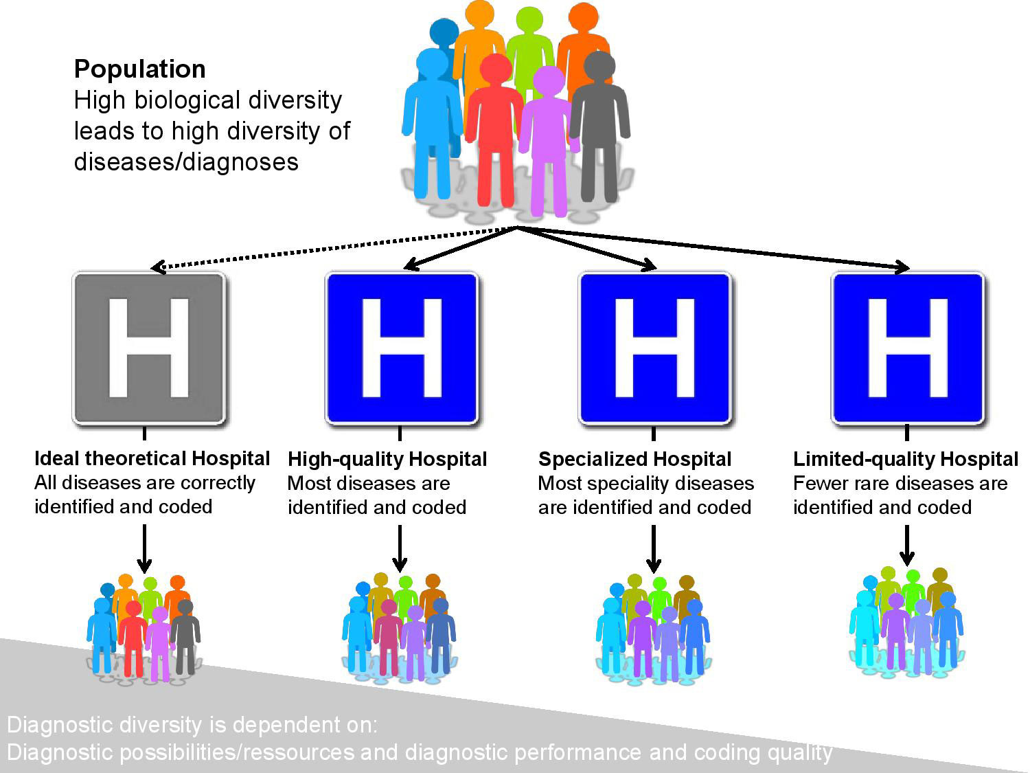 We found significant spatial and institutional heterogeneity of the DDI calculated from ICD-10-GM codes for acute in-patient medical care in Switzerland. Because of the natural diversity of human beings, a higher DDI is more likely to approach the true biological diagnostic diversity of a population (fig. 1 – working hypothesis). Although it is impracticable to verify the correctness of diagnoses of each of the hospital files [16], the fact that some institutions rarely coded low-frequency conditions and, thus, had a low DDI, points to diagnostic limitations. Thus, regions and institutions with less diagnostic diversity are more likely to under- or misdiagnose a significant proportion of patients, missing the chance of an optimal alignment between health condition and treatment – with the potential for worse outcome.