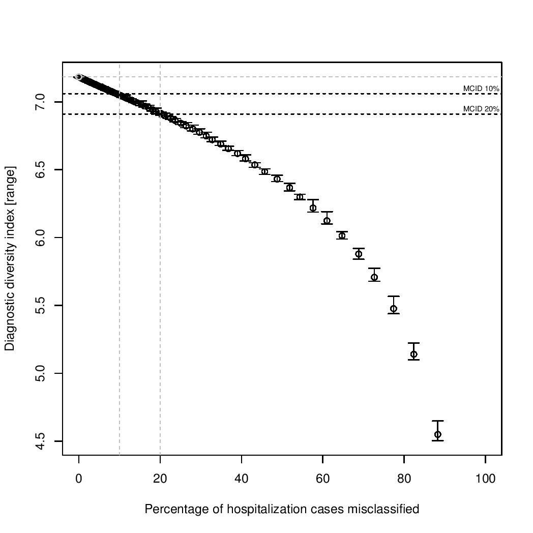 with the number of diagnoses (ICD-10-GM codes), ln the natural logarithm and the proportional abundance of the diagnosis. The Shannon diversity index, originally developed in information theory, is one of the most commonly used diversity indices. It is widely used in ecological science, but has also been previously reported as a promising measurement in health service research [12]. In our analysis, the Shannon diversity index accounts for both the abundance and the evenness of the ICD-10-GM at the HCR or institution level. It assumes that all ICD-10-GM codes are equal and therefore treats equally the most abundant as well as the rarest codes. This index has a lower bound of 0 but no upper bound. It increases logarithmically, proportionally to the diversity of codes employed. Numerical simulations were performed to evaluate the effect of misdiagnoses in the DDI. We used nonparametric bootstrapping to resample the ICD-10-GM codes by removing an increasing proportion of ICD-10-GM codes in a prevalence-dependent fashion. More specifically, we used this procedure to randomly remove rare ICD-10-GM codes replacing them by randomly chosen more common codes. This resulted in an artificial decrease of the diagnostic diversity and an increase in the rate of misdiagnoses. We arbitrarily defined the minimum clinically important difference (MCID) as a 10%-misdiagnosis, i.e., 1 in 10 patients seen on the ward leaves the hospital with an imprecise or misdiagnosis. This cut-off was chosen due to its clinical relevance. The diagnostic performance was considered sufficient when an institution/HCR has a DDI above this cut-off. A second cut-off was set at 20% misdiagnosis and used for illustration purposes in some analyses. MCID is level-specific (e.g. HCR, institution) and is different within each ICD-10-GM code category. In a sub-analysis, chapters I to XIV (A-N) of the ICD-10-GM were analysed separately (codes O-Z being used for specific purposes including pregnancy or various injuries). All analyses were done using the R statistical software [24] including the following extension packages: vegan [25], ade4 [26].
