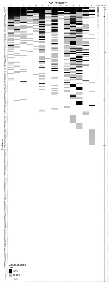 Figure 4 Heat map of the diagnostic fitness (DDI) of acute medical care hospitals within 14 ICD-10-GM chapters (A–N). For each chapter the 10% (minimum clinically important difference; MCID) and 20% misdiagnosis thresholds were established by simulation. In the case of a DDI >10% and >20% threshold the respective bar is shown in dark and light grey for each chapter for each of the hospitals. The number of hospitalisation cases per institution is coded in different bullet sizes on the right side (bigger indicating a larger caseload). This view allows four groups of acute medical care hospitals to be distinguished (see text).