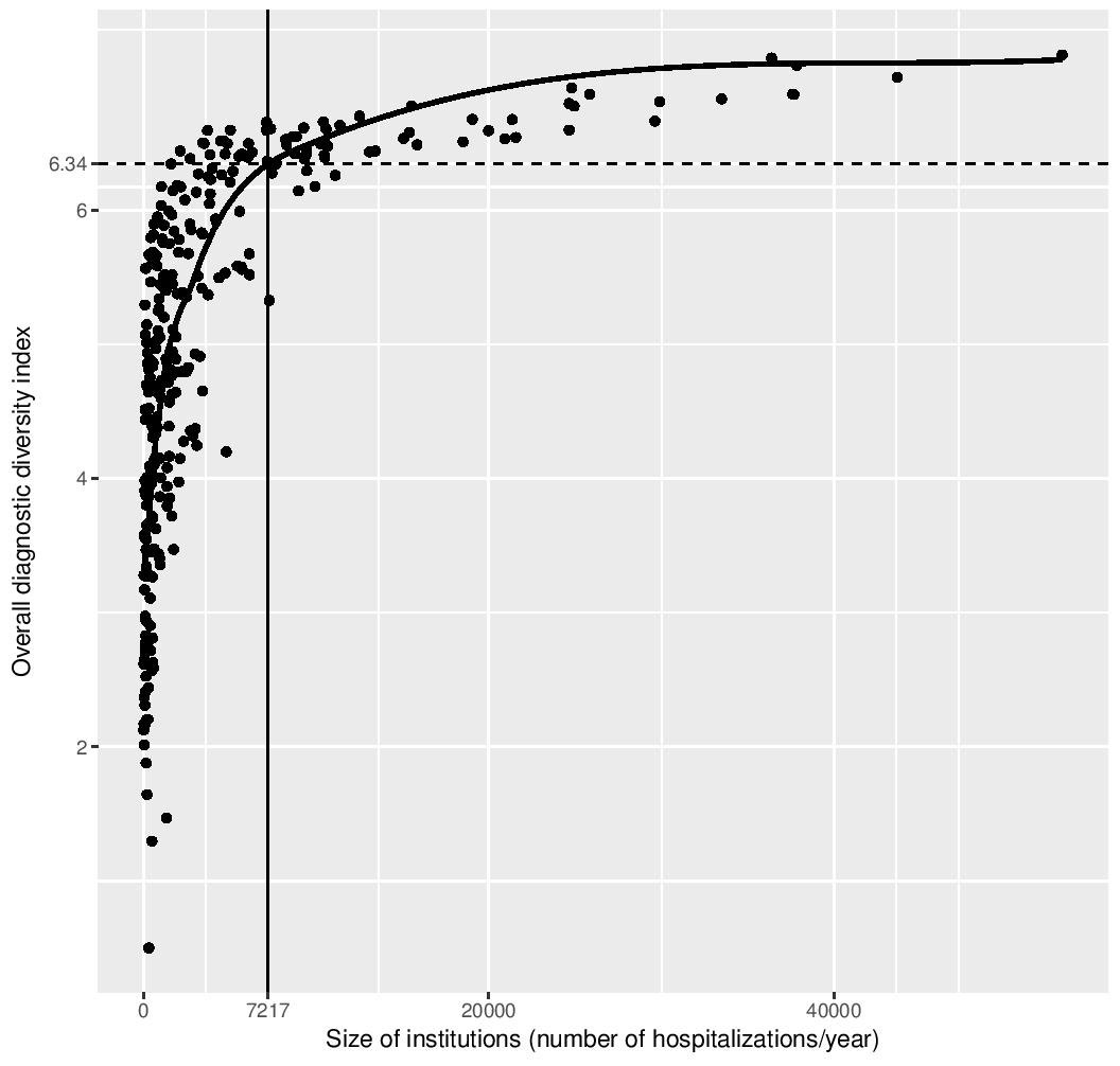 Local regression (loess) representing a smooth curve through the set of data points is depicted. In general, institutions with an annual caseload >7217 hospitalisation cases (intersection point where the loess regression crosses the 10% misdiagnosis diagnostic diversity index [DDI] threshold) were more likely to have an adequate DDI.