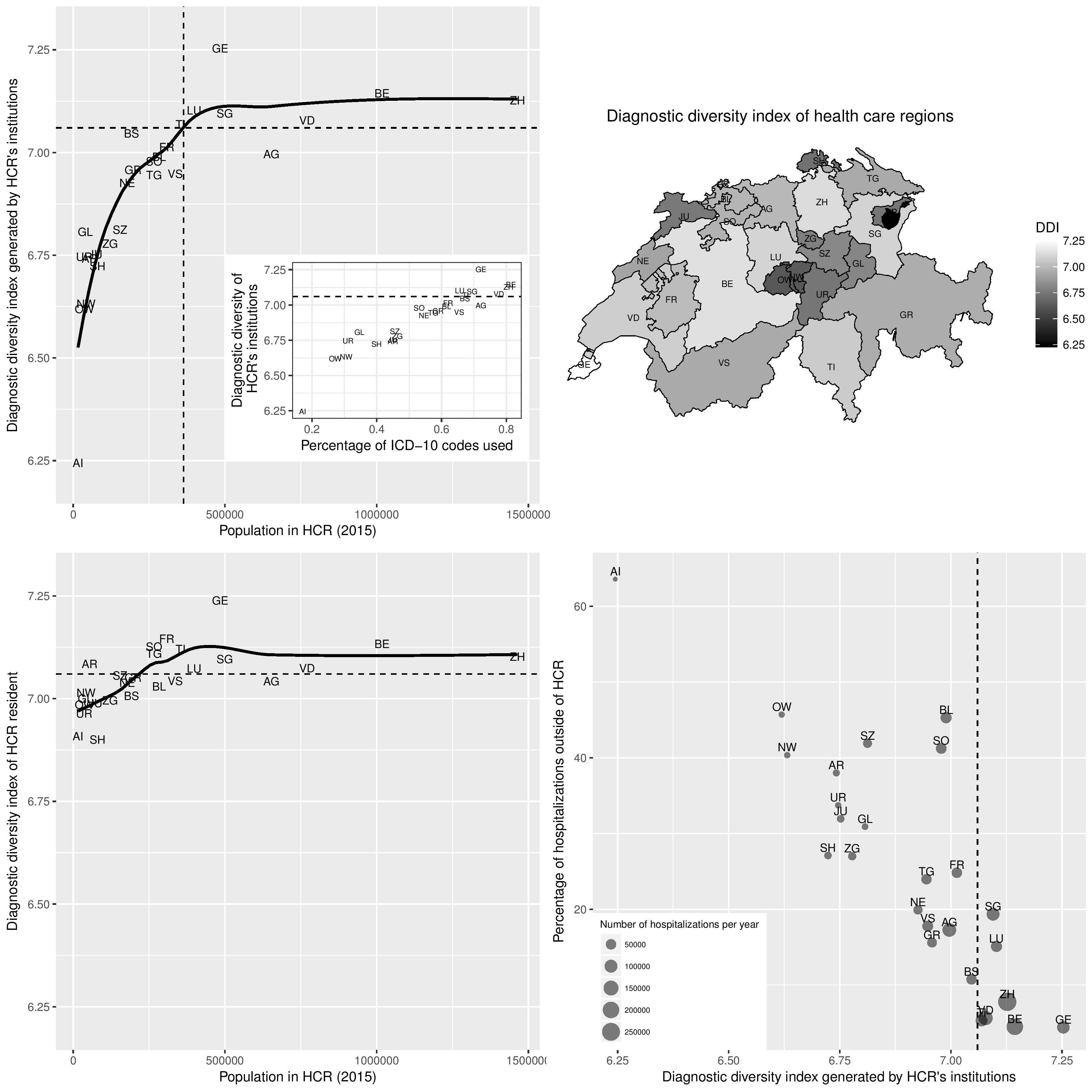 Figure 5 Diagnostic diversity index (DDI) in Swiss health care regions. The upper left panel displays the relationship between the size of the healthcare region (population) and the diagnostic diversity index generated by healthcare regions’ institutions (inset including the representation of the diagnostic diversity as a function of the percentage of ICD-10-GM codes used). The minimum clinically important difference (MCID) of 10% misdiagnosis is represented using a dashed line. The intersection point where the MCID 10% misdiagnosis and the loess regression curve cross defines the cut-off of sufficient diagnostic diversity. In general, health care regions with a population size >363,522 were likely to have an adequate DDI. The upper right panel provides choropleth representation of the DDI generated by the institutions of each healthcare region. The lower left panel shows the relationship between the size of the healthcare regions (population) and the DDI of the region’s residents. The lower right panel depicts the relationship between the DDI generated by healthcare region’s institutions and the percentage of hospitalisation outside of health care regions. The dashed line represents the DDI threshold of 10% misclassification. The health care regions (Swiss cantons) are coded as follows: AG = Aargau; AI = Appenzell Innerrhoden; AR = Appenzell Ausserrhoden; BE = Bern; BL = Basel-Landschaft; BS = Basel-Stadt; FR = Fribourg; GE = Geneva; GL = Glarus; GR = Graubünden; JU = Jura; LU = Luzern; NE = Neuchatel; NW = Nidwalden; OW = Obwalden; SG = St. Gallen; SH = Schaffhausen; SO = Solothurn; SZ = Schwyz; TG = Turgau; TI = Ticino; UR = Uri; VD = Vaud; VS = Valais; ZG = Zug; ZH = Zürich.