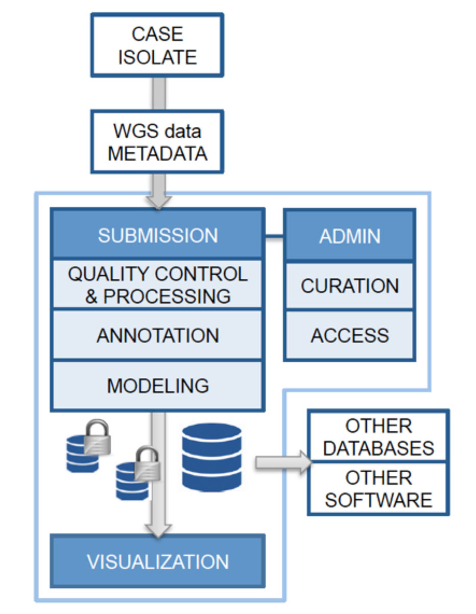 Figure 2 Envisioned workflow for the surveillance platform. After isolating a strain, collecting epidemiological data and sequencing it, the user uploads raw data and metadata into a central or local/private database using the submission portal. After submission, these data are quality controlled and then (semi-)automatically processed, to perform e.g. genome assembly, and MLST, SNP and resistance calling. The resulting data are used for phylogenetics and predictive modelling of e.g. transmission dynamics. All these data are stored in a structured database with controlled access, and visualised in a user-friendly interface. For open-data, the structured database may also be used/queried by other applications or pushed to external databases and knowledge bases. In addition to the submission portal, an administration portal will be developed, notably to manage users and rights, as well as a curating portal to edit controlled vocabularies and define curated reference strains and variants (e.g., for resistance).