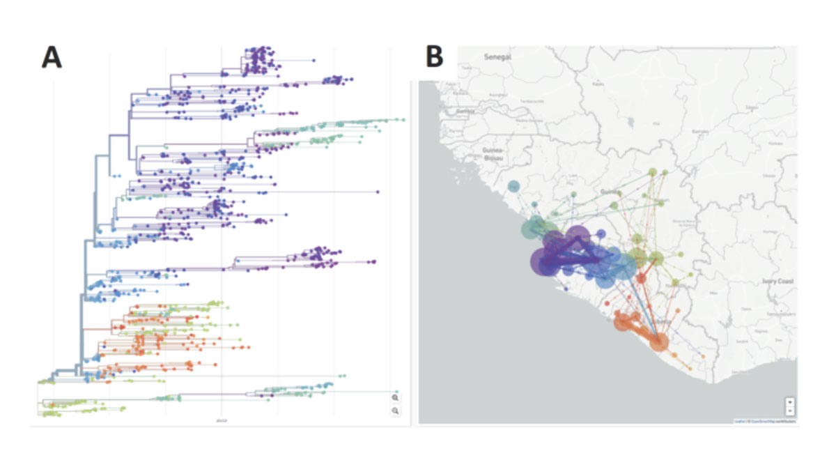 Figure 1 NextStrain tool to analyse transmission of pathogens. (A) Phylogenetic tree of the Ebola virus outbreak in West Africa. Colours represent different geographic regions, and x-axis reflects a time scale during the outbreak. (B) Transmission dynamics modelled in real-time with new viral strains based on WGS data.