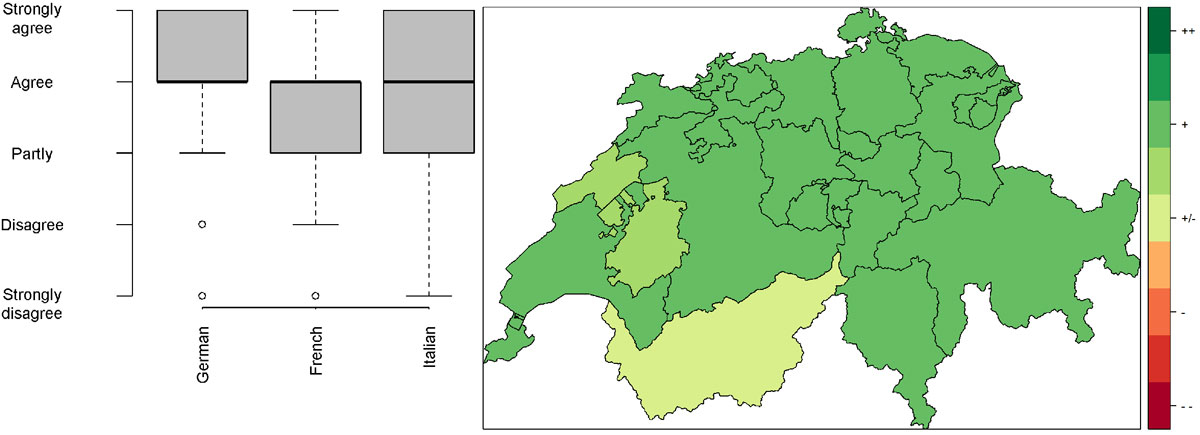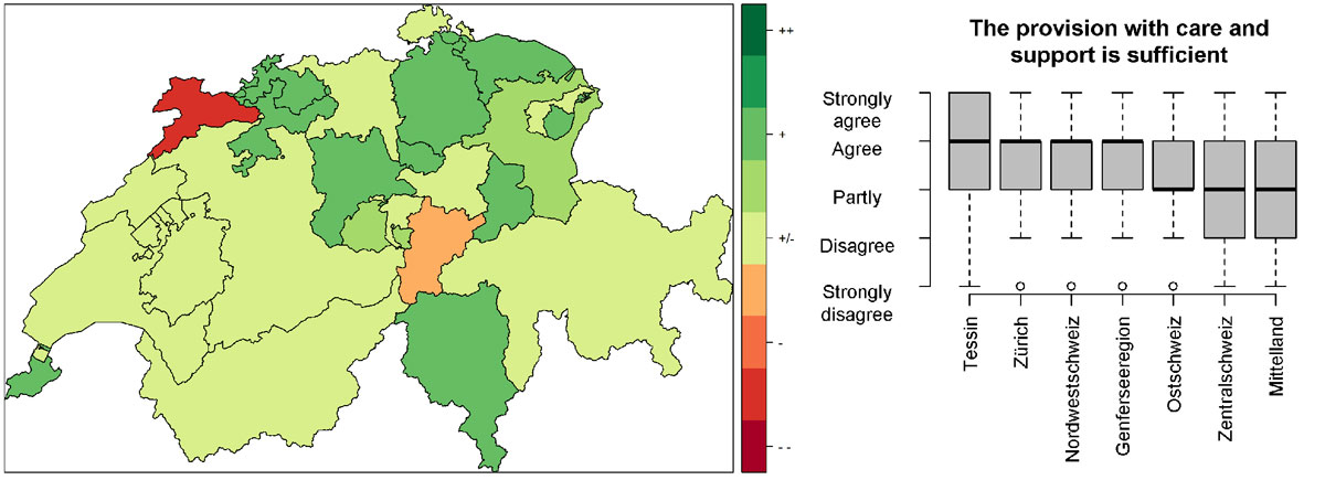 Figure 3 Regional differences in the perception of the provision of care and support facilities. The median across all cantons of Switzerland is presented in the spatial plot (left), and across seven major Swiss regions in the boxplot (right). ++ = strongly agree with sufficient provision of care and support facilities, +/- partially agree, -- strongly disagree with sufficient provision of care and support facilities.