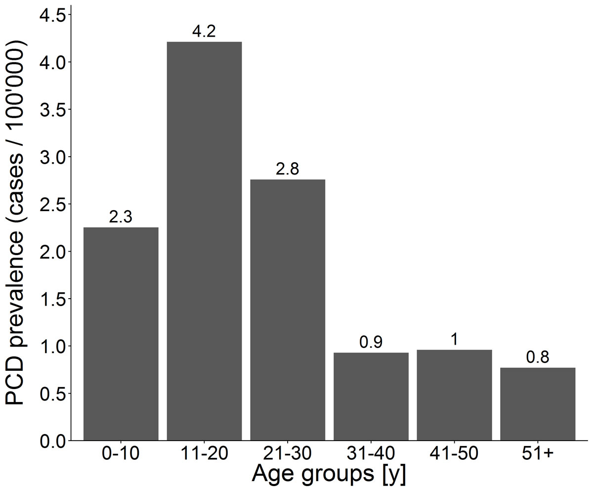 Figure 2 Prevalence of PCD diagnosed in Switzerland by age group, calculated by dividing the number of patients identified in the Swiss PCD registry by the number of the people in the respective age group living in Switzerland. Prevalence is presented as cases/100,000 inhabitants.