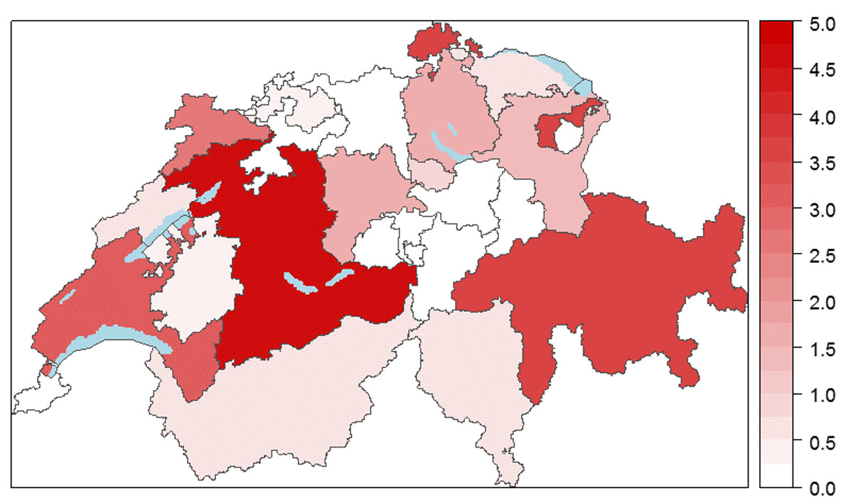 Figure 3 Prevalence of diagnosed PCD patients treated in the different cantons of Switzerland. The scale on the right represents PCD cases per 100,000 inhabitants.