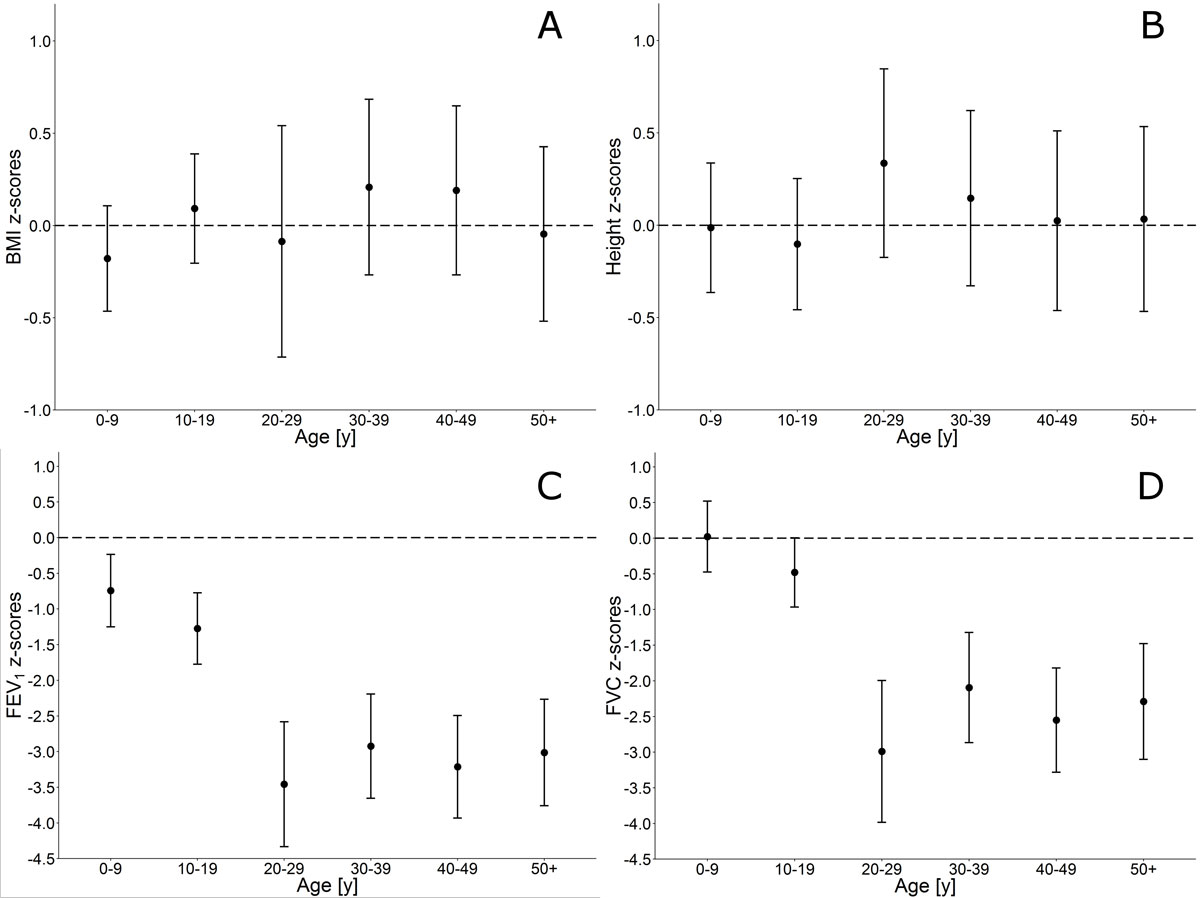 Height (A) and BMI (B) by age group compared to national references (Braegger et al. Paediatrica. 2011;22:9–11 [32]); FEV1 (C) and FVC (D) by age group compared with GLI international references (Quanjer et al. Eur Respir J. 2012;40:1324–43 [34]). All values are presented as mean z-scores (95% confidence intervals) after adjusting for sex and level of diagnostic certainty, calculated using multivariable linear regression models.