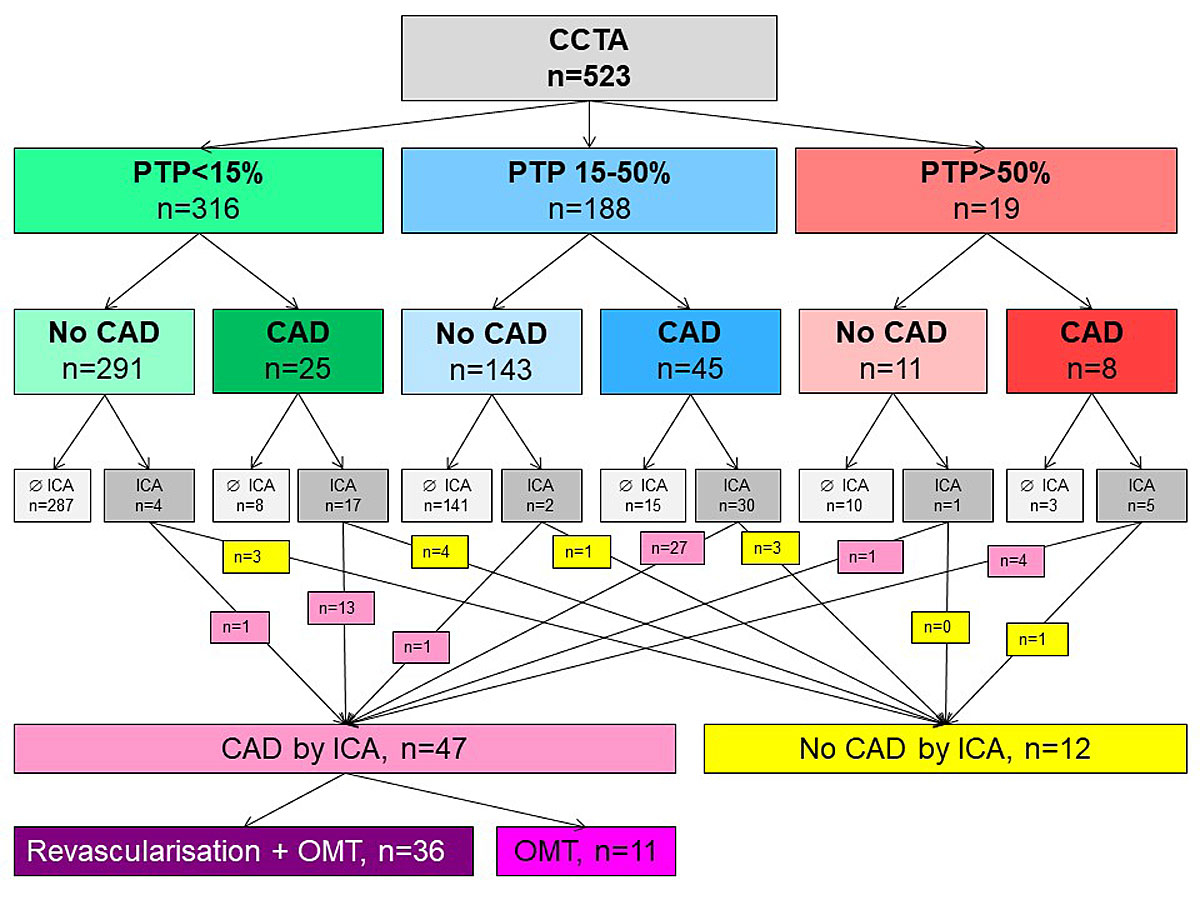 Figure 1 Diagram showing the diagnostic pathway in all patients undergoing coronary computed tomography angiography (CCTA) according to the three pre-test probability (PTP) categories.