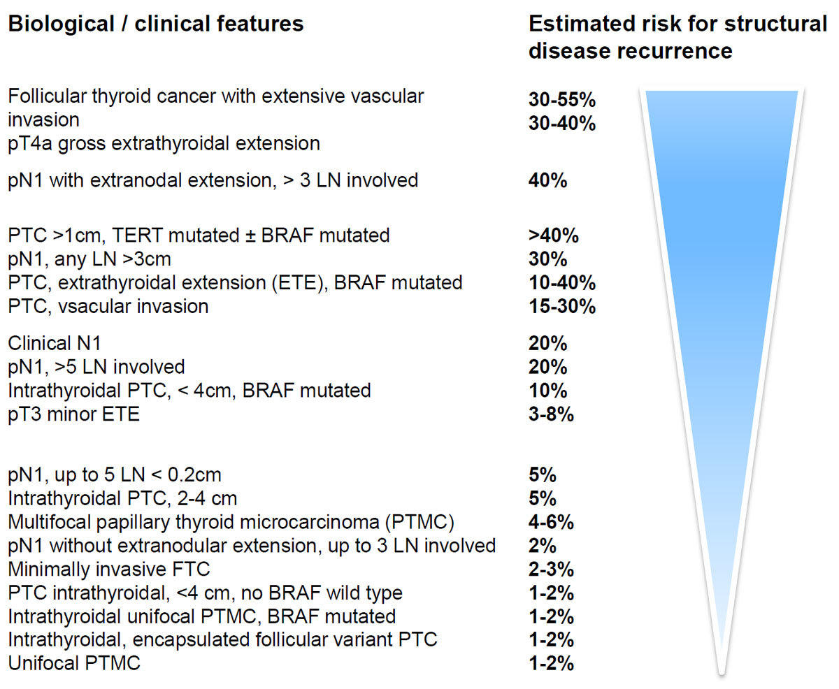 Figure 1 Description of the risk for structural disease recurrence as a continuum in differentiated thyroid cancer (adapted from [1]) in patients without structurally identifiable disease after first initial therapy.
