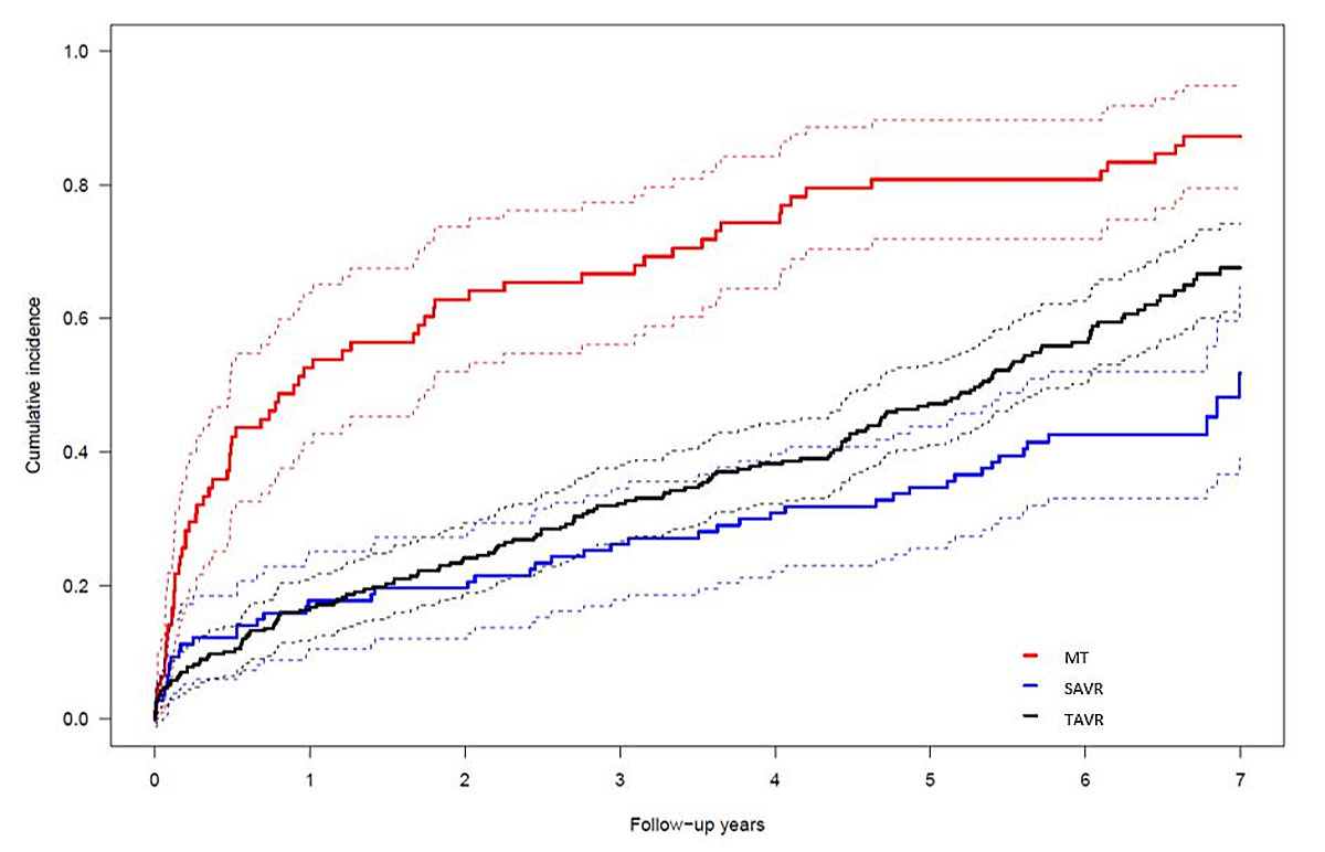 Figure 1 Cumulative incidence curves of all-cause death. The competing risk model shows patients allocated to MT (red), TAVR (black), and SAVR (blue). SAVR vs MT: p <0.0001; TAVI vs MT: p <0.0001. Confidence intervals are depicted as dashed lines.