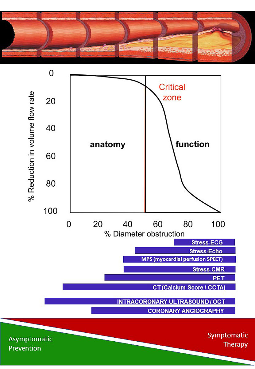 Figure 1 The slow progression of atherosclerosis and the development of coronary artery stenosis is shown in the upper part of the figure. As long as the coronary artery narrowing is less than 50%, there is no flow limitation. In stenoses of more than 50%, flow limitation starts and there is a decrease of flow. In the lower part of the figure, the diagnostic modalities are shown, which can be used to evaluate the different stages of the ischaemic cascade. Adapted from [5].