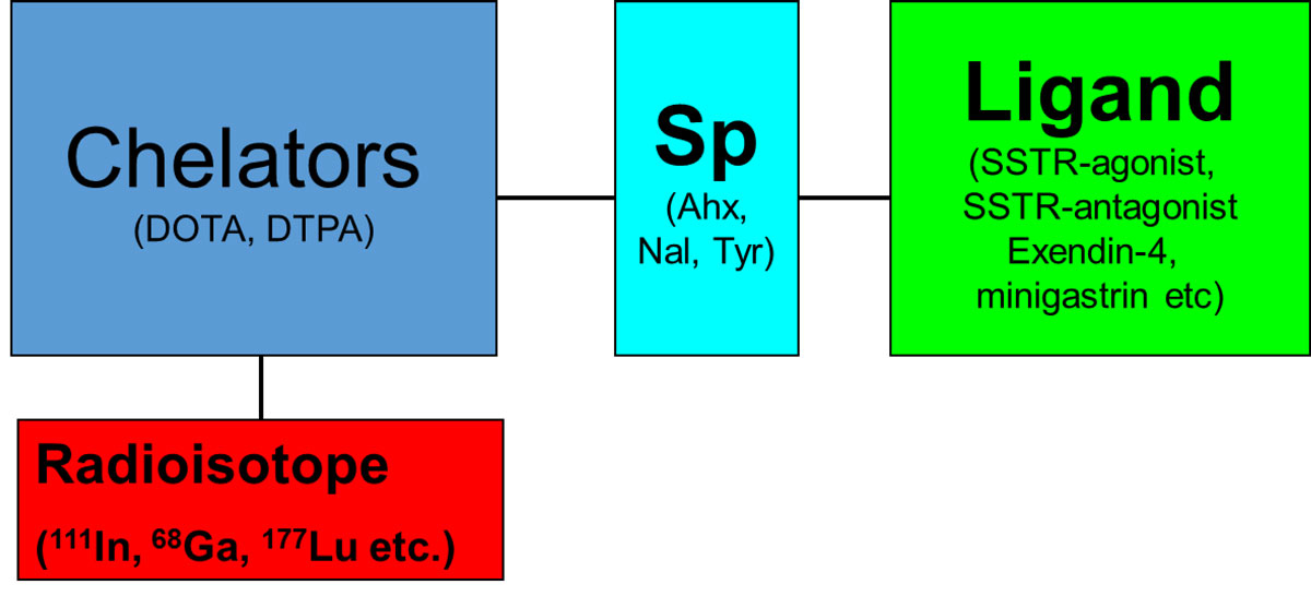 Figure 2 Structure of a peptide-receptor radionuclide for diagnostic and therapeutic administration. A radiopeptide is primarily composed of the specific ligand (i.e., SSTR-agonist, SSTR-antagonist, exendin-4, minigastrin, etc.), a spacer (Ahx, Nal, Tyr) linking the ligand to a chelator (DOTA; DTPA) and the radioisotope for SPECT (i.e., 111Ind:gamma-emitter) or PET (i.e., 68Ga: positron emitter) or therapeutic use (i.e., 177Lu: combined beta and gamma emitter).