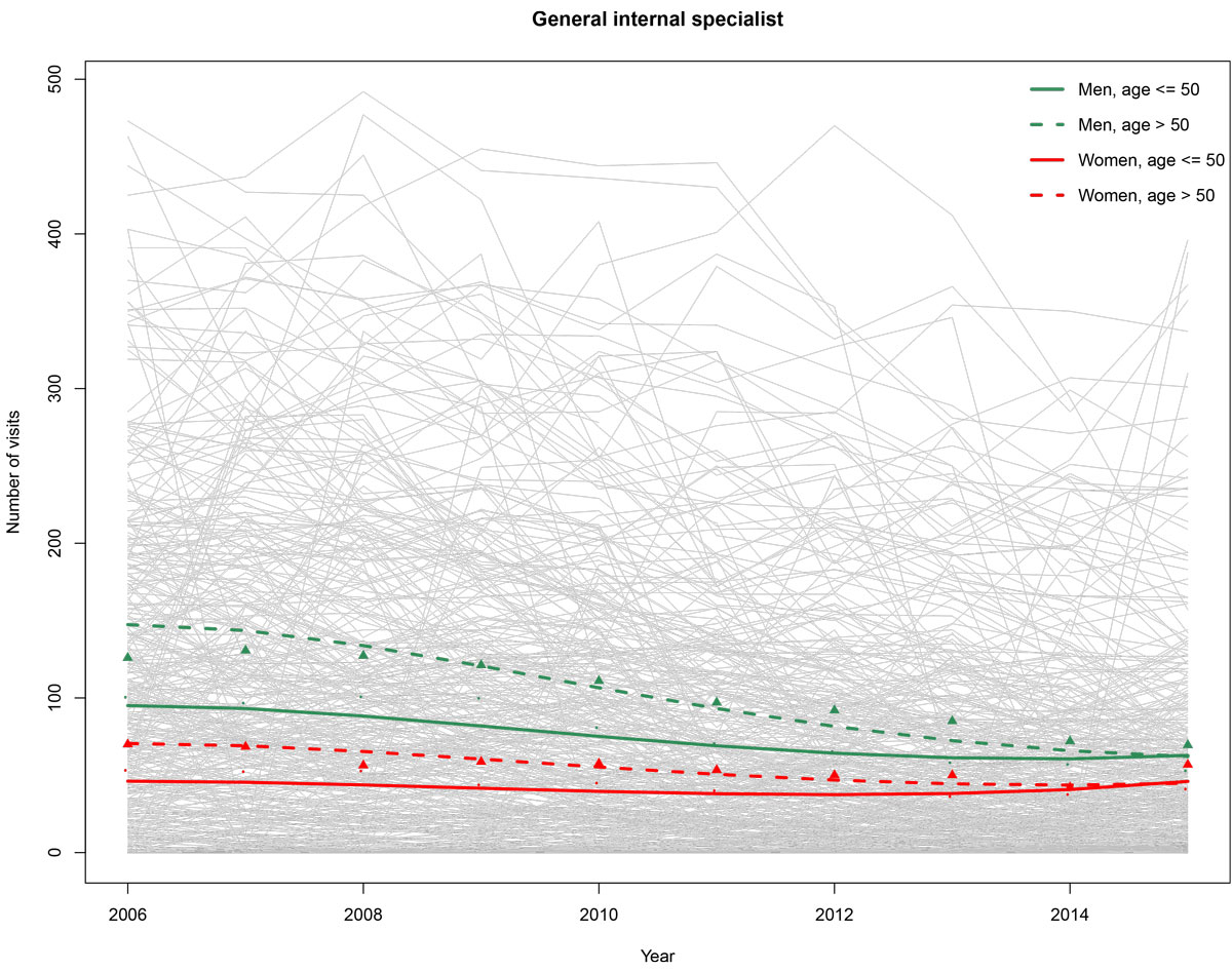 Figure 1 Evolution of home visits made by general internists in the canton of Vaud between 2006 and 2015, by gender and baseline age. Grey solid lines: spaghetti plot of annual number of visits per physician; 1 line = 1 physician. Dots: observed average number of home visits per year per physician, physicians up to 50 years old, green = men, red = women. Triangles: observed average number of home visits per year per physician, physicians older than 50 years, green = men, red = women. Green and red lines: predicted values of average number of home visits from the regression model, green = men, red = women, solid line = physicians up to 50 years old, dashed line = physicians older than 50 years.