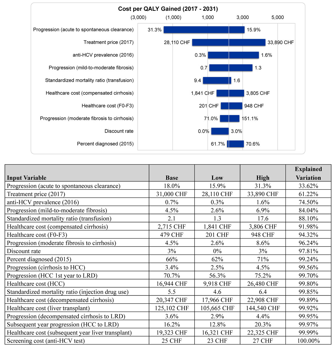 Figure 2 Sensitivity analysis around the average cost per QALY gained and explained variation by input variable, 2017–2031.