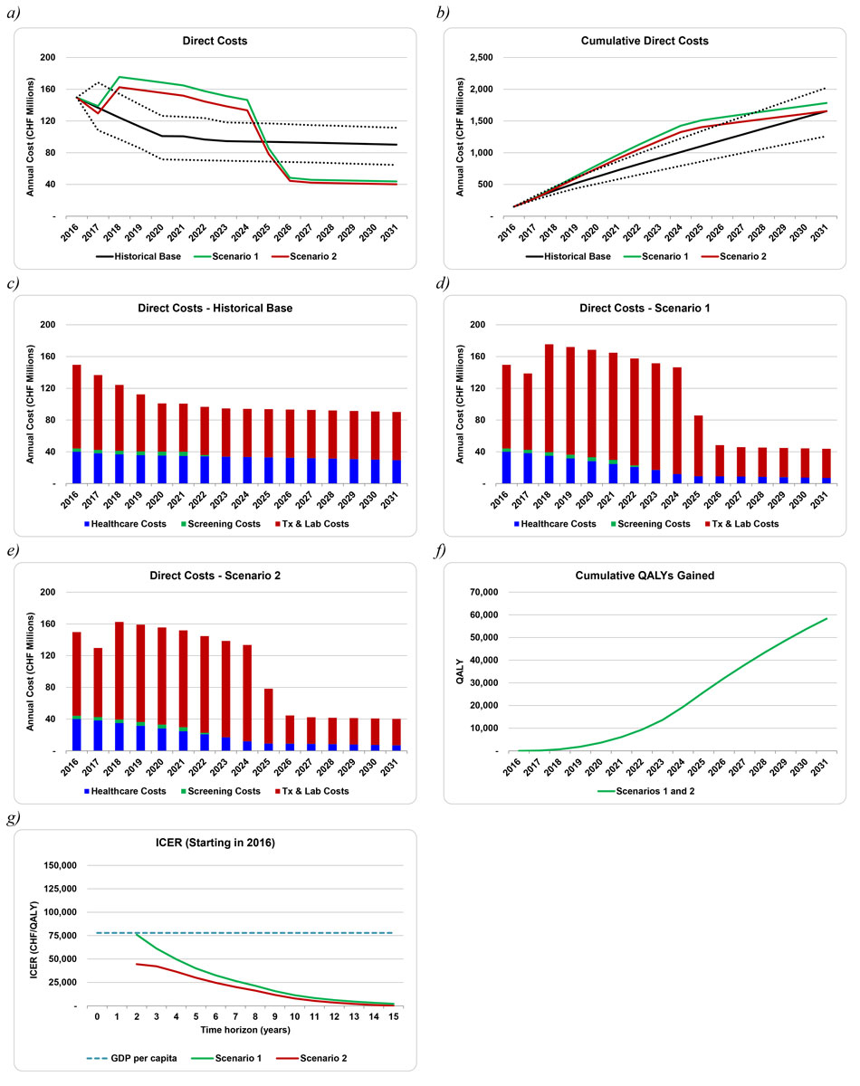 We developed a disease burden and economic impact model, considering a formal Swiss healthcare sector perspective, to evaluate direct costs, health effects measured in quality-adjusted life years (QALYs), and the incremental cost-effectiveness ratio (ICER). Two HCV treatment scenarios, an intervention and a comparator scenario, were developed, considering the entire HCV RNA-positive population in Switzerland, and the outcomes were measured over a 15-year time horizon from 2016 to 2031. Additionally, a net-zero cost scenario was developed in which the treatment price associated with the intervention scenario was calculated to achieve break-even by 2031.