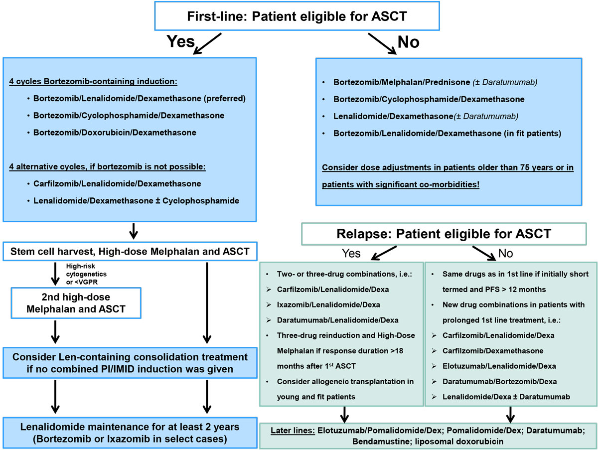 Figure 1 Treatment algorithm for first and later lines in patients, according to their eligibility for autologous stem cell transplantation. ASCT = autologous stem cell transplantation; VGPR = very good partial remission; Len = lenalidomide = PI = proteasome inhibitor; IMID = immunomodulatory drug; Dexa = dexamethasone; PFS = progression-free survival